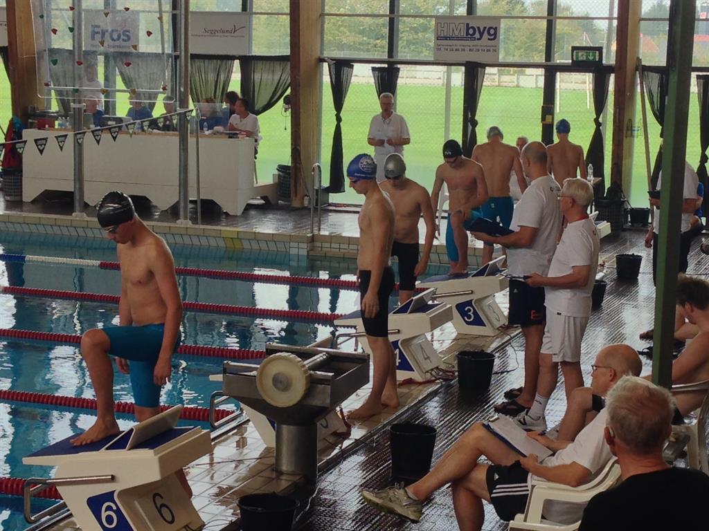 Billede viser Andreas Foverskov på bane 5, og Frederik Palmø på bane 1, umiddelbart før 100 meter bryst finale. Billede venligst stillet til rådighed af Helle Palmø